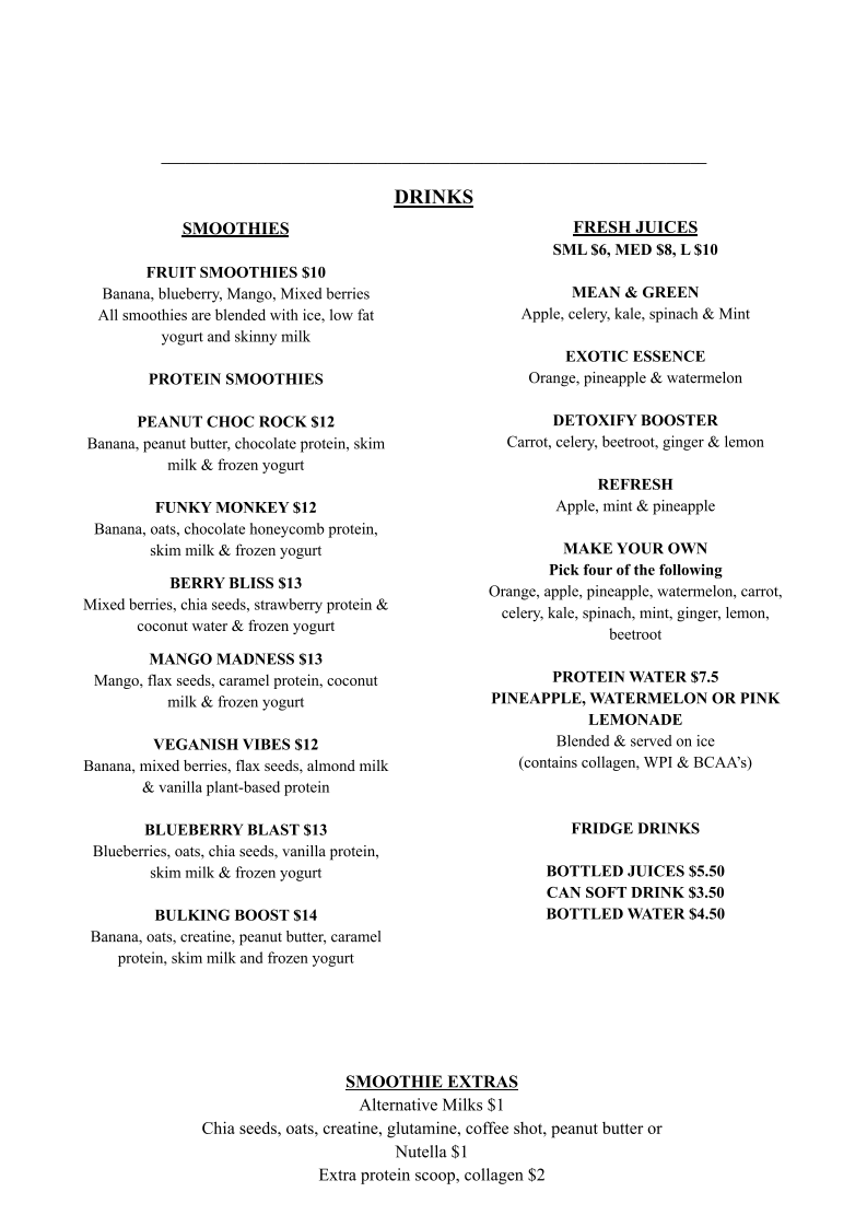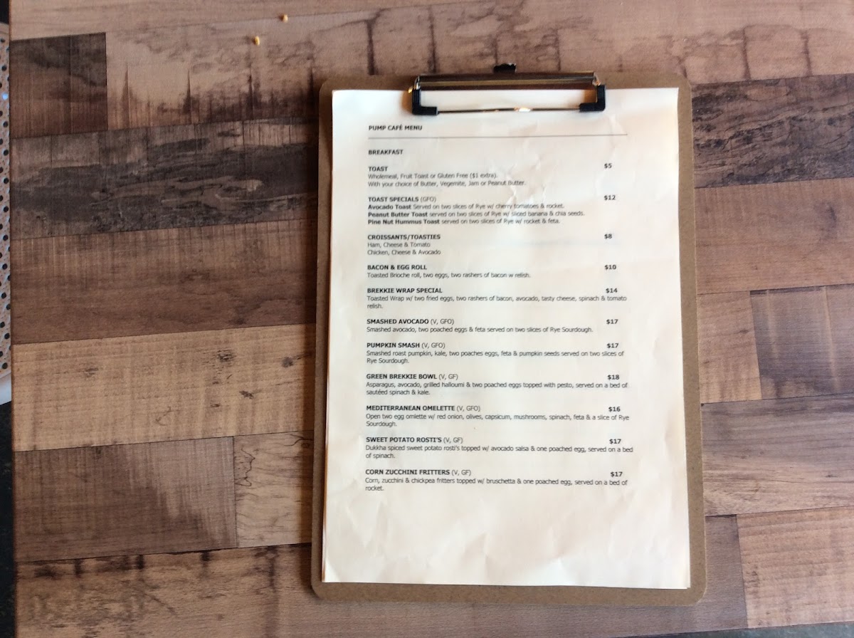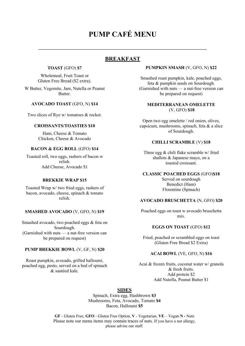 The menu at Pump Cafe offers a delightful range of breakfast, lunch, snacks, and beverages that cater to various tastes. For breakfast, you can enjoy Toast, Avocado Toast, or more indulgent options like Croissants/Toasties or the Bacon & Egg Roll. If you're after something heartier, the Brekkie Wrap is also a great choice. Sides like Spinach, Egg, Hashbrown, Mushrooms, and Feta can be added to elevate your meal. For lunch, the Salad w/ Cheese and Mayo or the Club Sandwich offer fresh, light options, while the Roast Vegetable Pesto and Chicken Pesto sandwiches are perfect for those craving something more savory. The Chicken Caesar Wrap rounds out the lunch menu with a classic favorite. For snacks, the cafe serves various energy bites like the Espresso Ball, Peanut Butter Ball, Bliss Ball, Lemon Ball, and Cinnamon Ball, ideal for a quick pick-me-up. When it comes to drinks, Pump Cafe offers an impressive selection of hot beverages, including Small, Medium, and Large Hot Coffees and Teas, alongside refreshing iced options like Canned Iced Latte, Canned Iced Mocha, and the Iced Coffee. The milkshakes come in Kids and Regular sizes, with flavors to suit every preference. For something healthier, their smoothies like the Fruit Smoothie, Peanut Choc Rock, Funky Monkey, Berry Bliss, and Mango Madness are sure to satisfy. Additionally, the Mean & Green and Exotic Essence fresh juices offer a rejuvenating boost, and the Protein Waters in Pineapple, Watermelon, and Pink Lemonade are a great way to hydrate while staying on track with your nutrition.